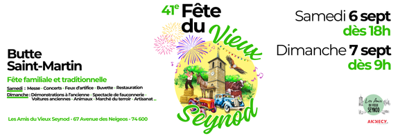 L’association les Amis du Vieux Seynod organise le samedi 06 septembre de 18h à 00h et le dimanche 07 septembre de 9h à 18h la 41e Fête du Vieux Seynod. Événement incontournable du territoire annécien, la Fête du Vieux Seynod fait revivre le temps d'un week-end les traditions locales, loin de la nostalgie mais dans un esprit de partage des savoir-faire, de convivialité et de divertissement.