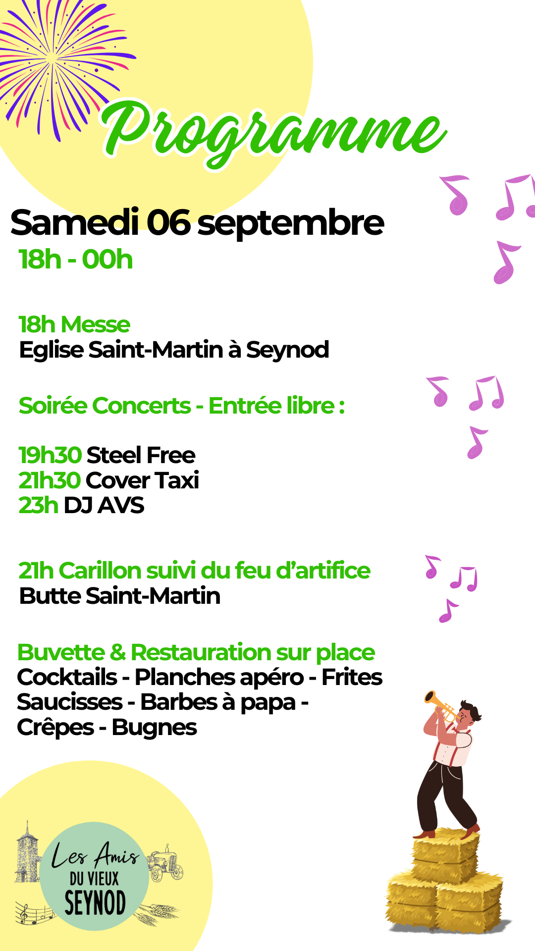 Le samedi 06 septembre sera proposé aux visiteurs la traditionnelle Messe dès 18h à l’Eglise Saint-Martin à Seynod suivie une soirée concerts entrée libre avec les groupes Steel Free et Cover Taxi suivi du Carillon de l’association et du feu d’artifice sur la Butte Saint-Martin.