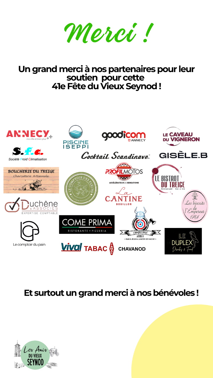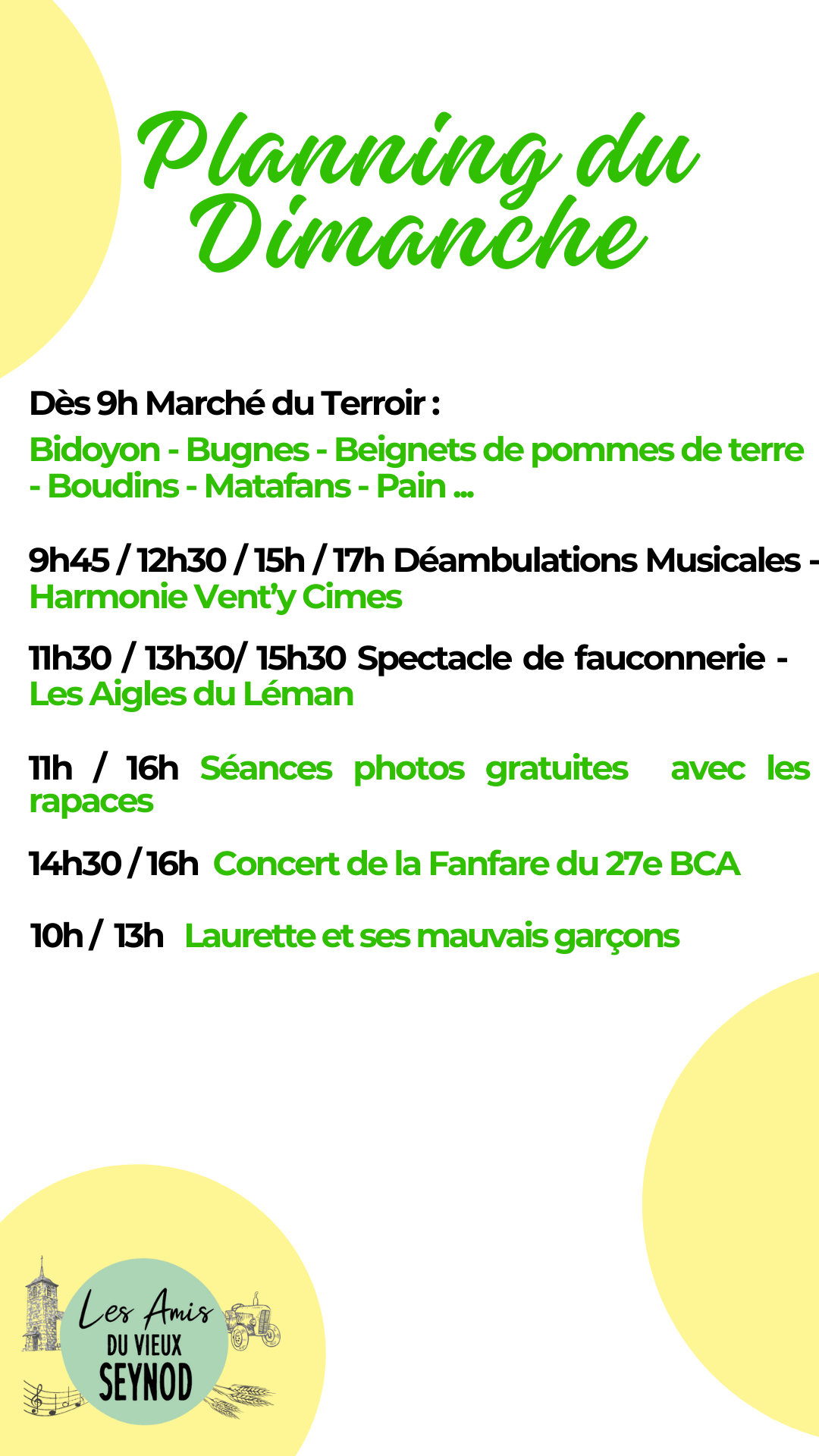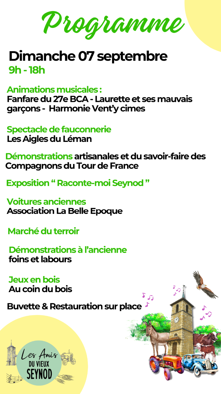 Le dimanche 07 septembre, la Fête traditionnelle ouvrira ses portes avec un marché du terroir, des animations musicales (l’Harmonie Vent’y cimes, Laurette et ses mauvais garçons), des démonstrations de savoir-faire avec la présence d’artisans et des compagnons du Tour du France des Pays de Savoie, et pour le repas du midi : terrine de campagne, gratin dauphinois et diots , fromage et tarte maison par le traiteur La Ferme du Chénêt (possibilité de réservation pour le repas du midi au Magasin C’nos terroirs ou sur HelloAsso Les Amis du Vieux Seynod)